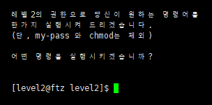 보이는 것 처럼 ExecuteMe라는 파일을 실행해보면 다음과 같은 화면이 나온다. 딱 한번만 level2의 권한으로 명령어를 실행할 수 있게 해준다는데, my-pass와 chmod는 허락되지 않았다. 그렇다면 계속해서 level2의 권한을 사용할 수 있는 방법은 없을까?