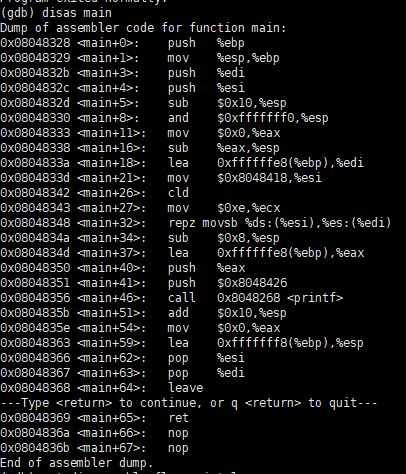 disassemble, disas [함수명] : 해당 함수 부분에 대해 disassemble 진행