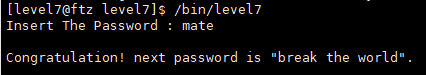 다시 /bin/level7를 실행하여 mate를 입력해주면 다음과 같이 비밀번호를 얻을 수 있다.