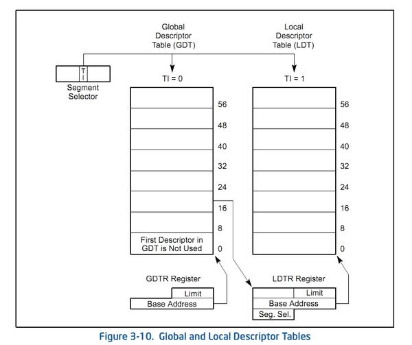 세그먼트 셀렉터에 값이 들어가면 CPU는 GDTP 레지스트리에 저장된 GDT의 제일 앞번지를 참조함. 그리고 셀렉터의 인텍스값*8을 진행, 요구한 디스크립터를 찾아냄. (8을 곱하는 이유 : 인덱스 값 * 바이트, 실제 물리 주소를 나타내기 위함.)