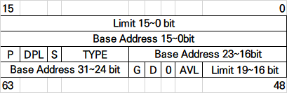 해당 명령문을 통해 GDT를 등록시킴. 명령문에서의 gdtr은 포인터로서, 다음과 같은 구조를 가진다.