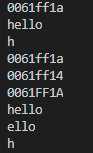 | 1 2 3 4 5 6 7 8 9 10 11 12 13 14 15 16 17 18 | #include<stdio.h> int main() {     char a[] = "hello";         char * ptr = a;     printf("%08x\n", &a);     printf("%s\n", a);     printf("%c\n", a[0]);     printf("%08x\n", &a[0]);     printf("%08x\n", &ptr);     printf("%p\n", ptr);     printf("%s\n", ptr);     printf("%s\n", ptr+1);     printf("%c\n", *ptr); } | cs |