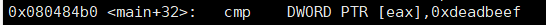 eip는 바로 다음에 실행할 명령어를 가리켜요. Instruction Pointer이니까요. 저기 명령어가 뭐죠? 딱 좋게 deadbeef 명령어와 eax에 저장된 메모리가 가리키는 곳의 값을 비교해요. 다음 명령어는 뭐죠? deadbeef입니다. eip를 뜯어봅니다.