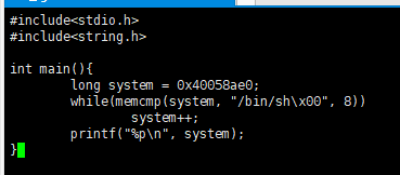 system 함수는 내부에 /bin/sh 문자열을 갖고 있기 때문에 위와 같이 간단한 코드를 짜서 해당 문자열의 주소를 얻어온다.