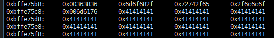 더 아래쪽의 메모리를 확인해보면 인자값이 다음과 같이 들어간 것을 확인할 수 있다. 대략 0xbffe75f8을 argv[2]의 위치로 고른다.